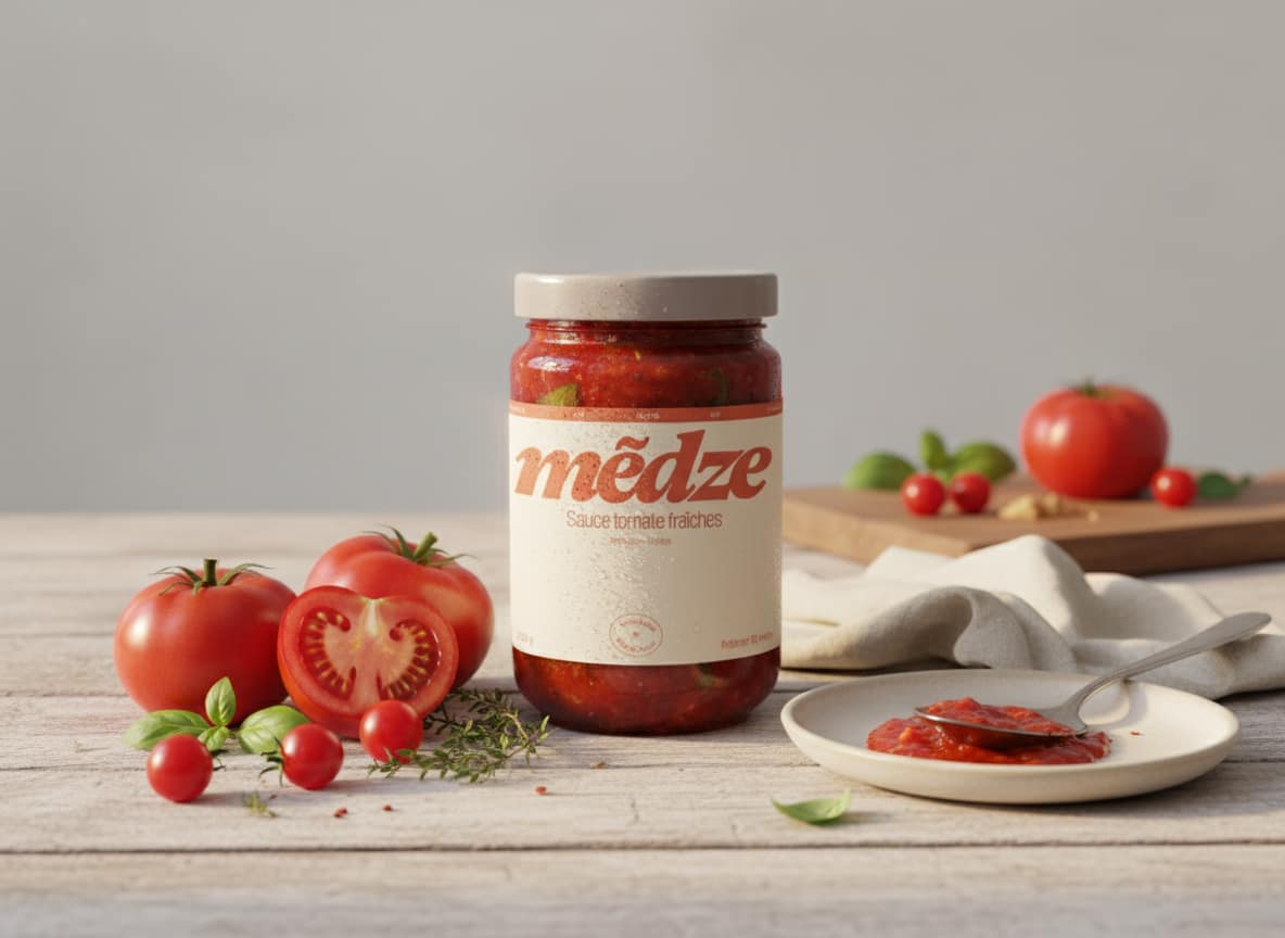 Tomates locales, huile d'olive, ail, basil, sel, poivre. Sans conservateur, sans colorant artificiel.